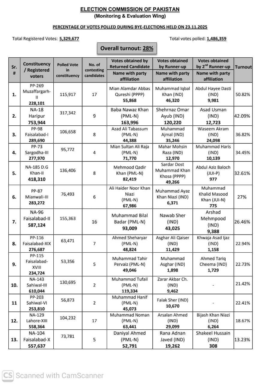 - NA-96, Faisalabad-II, NA-104, Faisalabad-X, NA-143, Sahiwal-III, NA-185, D.G.Khan-II, PP-73, Sargodha-III, PP-98, Faisalabad-I, PP-115, Faisalabad-XVIII, PP-116, Faisalabad-XIX, PP-203, Sahiwal-VI, PP-269, Muzaffargarh-II & Revised Form-33 of NA-66, Wazirabad & PP-87, Mianwali-III (Bye-Election) (Scheduled to be held on 23-11-2025)