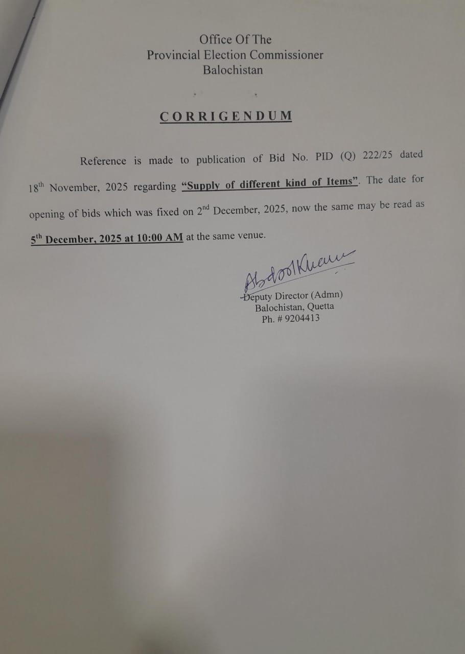 Corrigendum - supply of different kind of items- (The date for opening of bids which was fixed on 2nd December,2025, now the same maybe read as 5th December ,2025 at 10:00 am