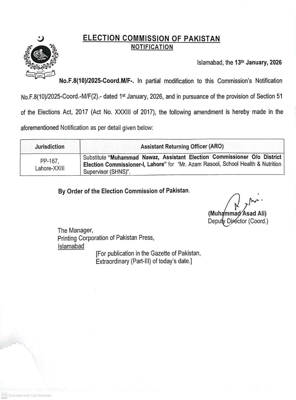 Notification - Amendment ARO for PP-167 Lahore-XXIII