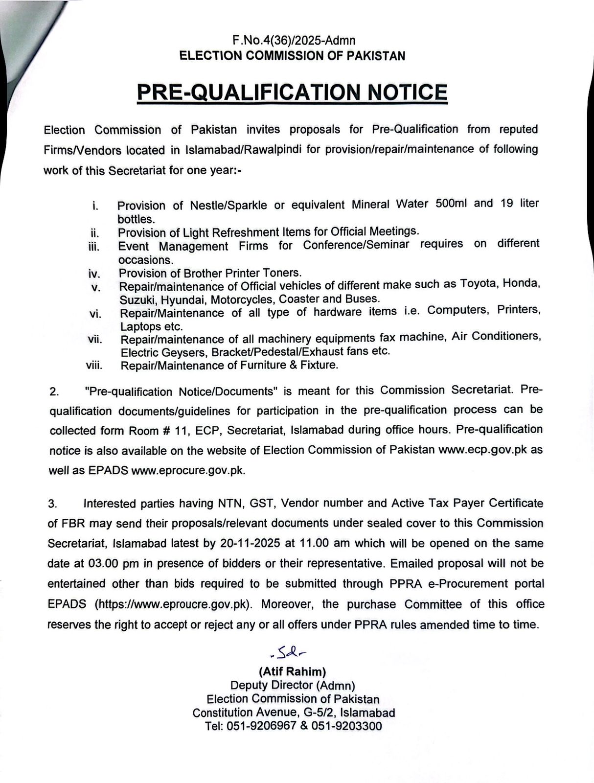 Pre-qualification notice for nestle/sparkle or equivalent mineral water, light refreshment, event management, toners for Brother printers, Repair and maintenance of Offical vehicle, hardware, IT equipment, machinery, furniture and fixture