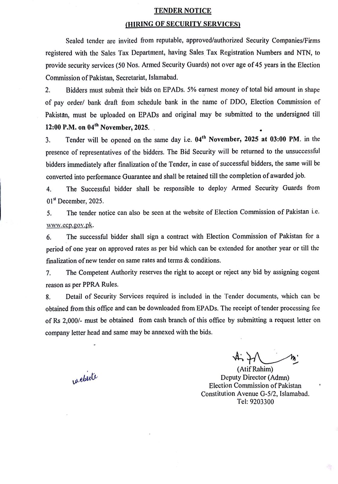 Tender notice - Hiring of Security Services (ECP Secretariat Islamabad)