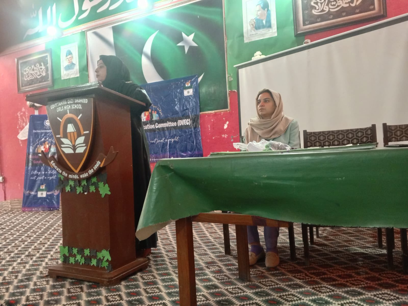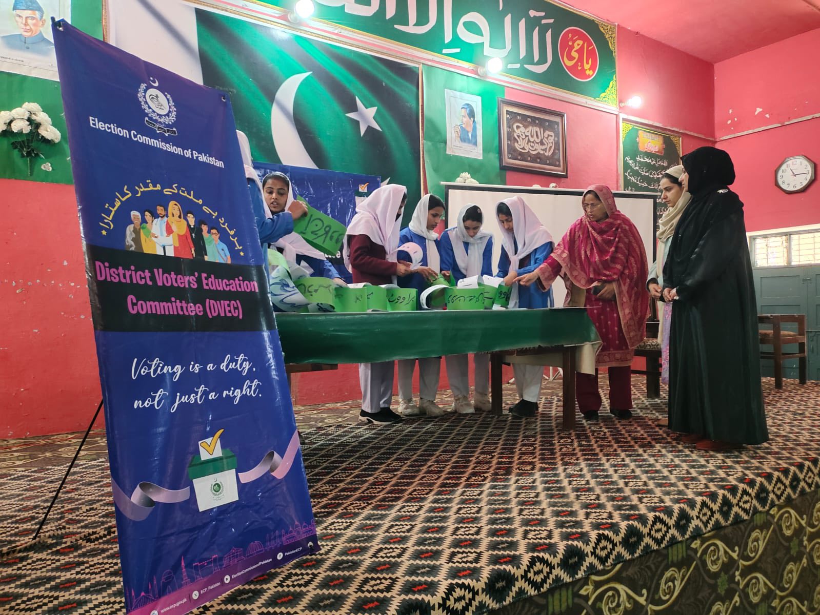 A “Ballot Buzz” voter awareness session was held at Govt. Tahira Qazi Shaheed School No. 1 Sheikhupura. DEC and AEC SKP highlighted the importance of voting; students actively formed a long paper chain with awareness messages.