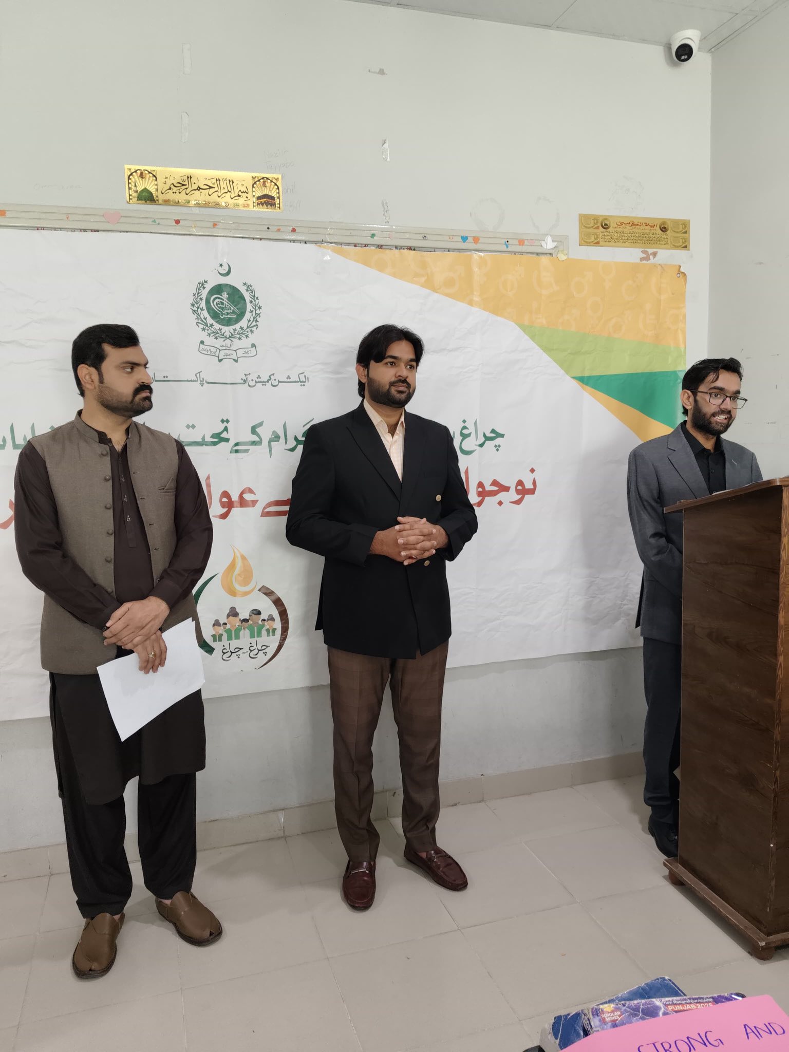 A voter awareness session by the DEC Office Vehari was held for students of Aspire Group of Colleges, Mailsi. The AEC briefed them on Pakistan’s electoral system and the value of each vote; students created a symbolic chain of voter awareness messages highlighting democratic inclusivity.