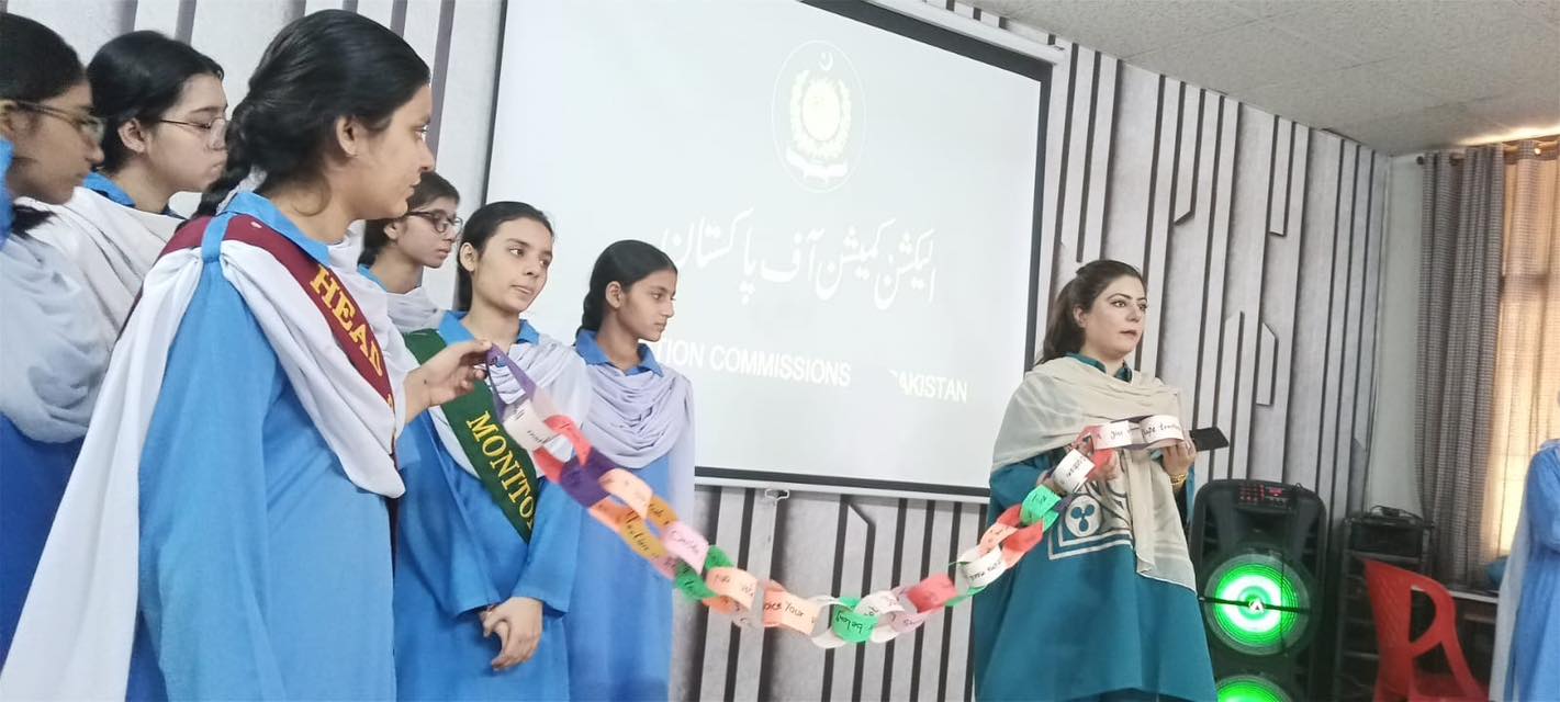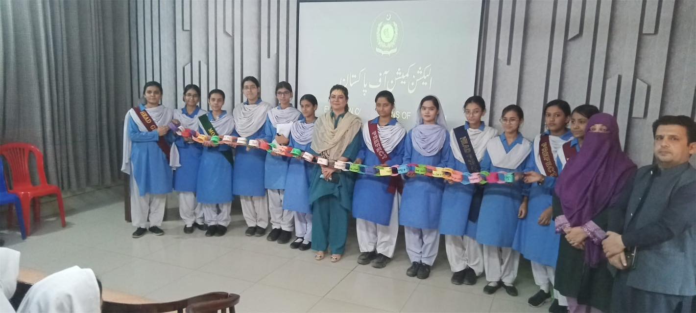 District Election Commissioner Karachi East Mr. Shahnawaz Brohi and Assistant Election Commissioner Ms. Sarwat Batool, engaged students during an ongoing youth awareness activity “Ballot Buzz – آپکا ووٹ، آپکی آواز” at Govt Girls High School Idara-e-Sharqia, Jacob Lines, Karachi. Students were briefed on the importance of voting and active civic participation and took part in a creative paper-chain activity symbolizing the collective strength of every vote.