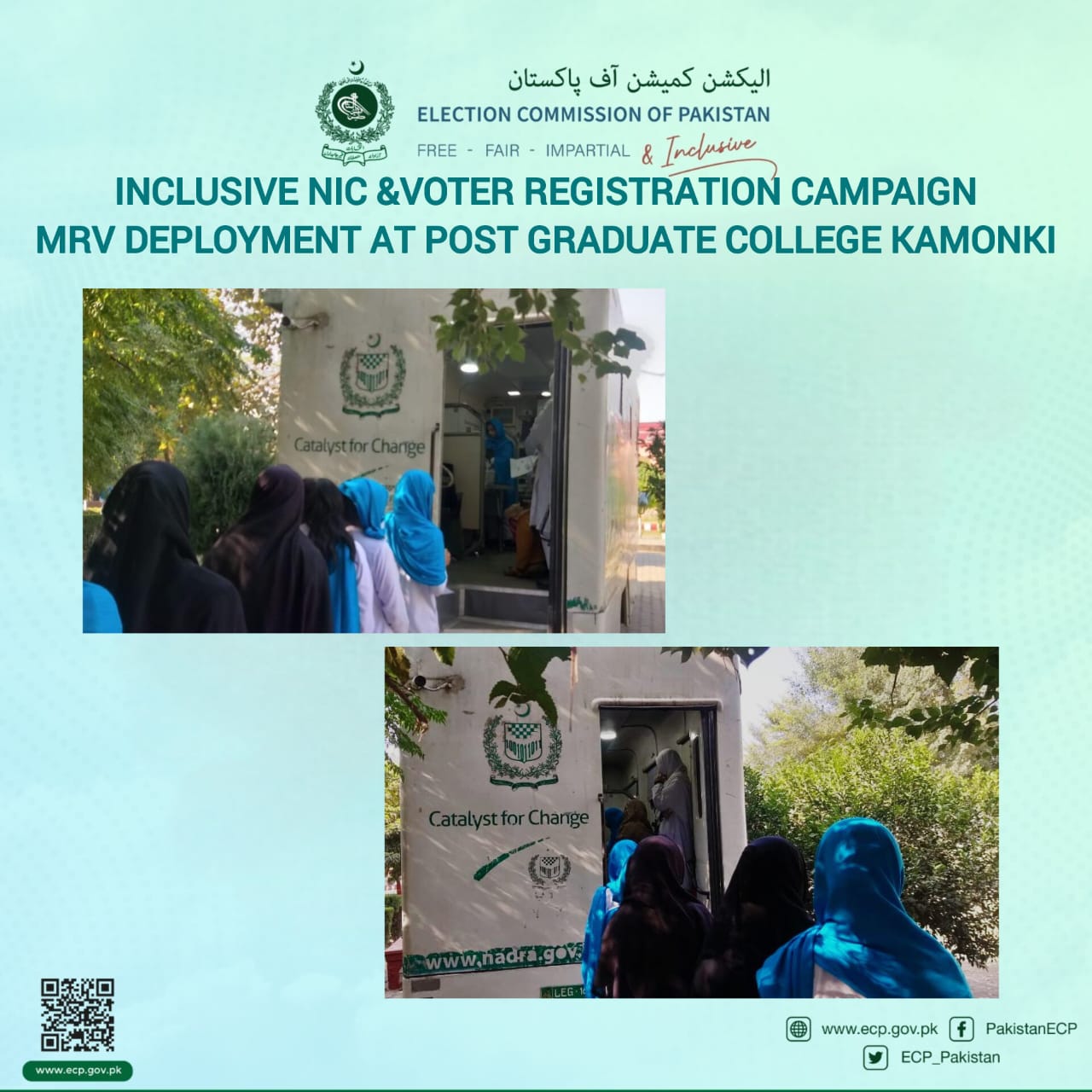 گورنمنٹ پوسٹ گریجویٹ کالج فار ویمن کامونکی میں طالبات نےنادرا ایم آر وی کے ذریعے قومی شناختی کارڈ بنوائے۔ الیکشن کمیشن آف پاکستان کی جانب سے خواتین ووٹرز کی رجسٹریشن کے فروغ کے لیے یہ اقدام کیا گیا۔